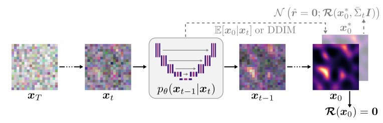 이제 Diffusion model에서 샘플링한 x0 ~ pθ(x0)가 위의 제약조건을 만족하도록 하기 위해 Residual 벡터 R을 정의한다.