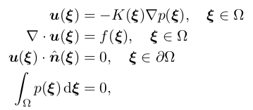 아래와 같이 permeability K가 주어졌을 때, velocity u와 pressure distribution p를 구하는 문제다.