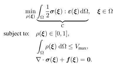예를 들어 Linear elasticity를 가지는 물질에 대해 (Stress-strain 사이 관계가 Hooke's Law를 따름) 최적의 material distribution을 찾는 문제는 아래와 같이 formulation할 수 있다.